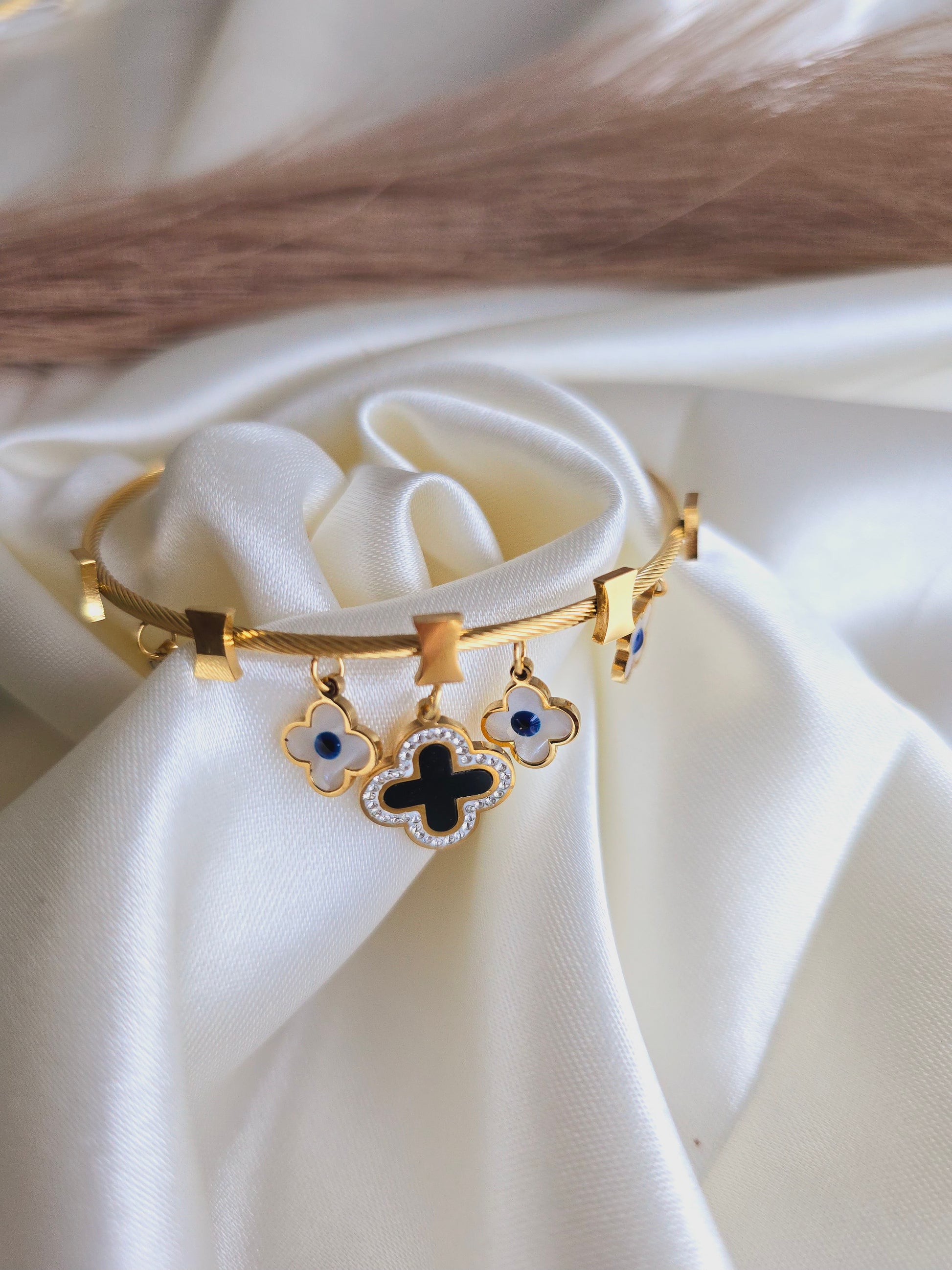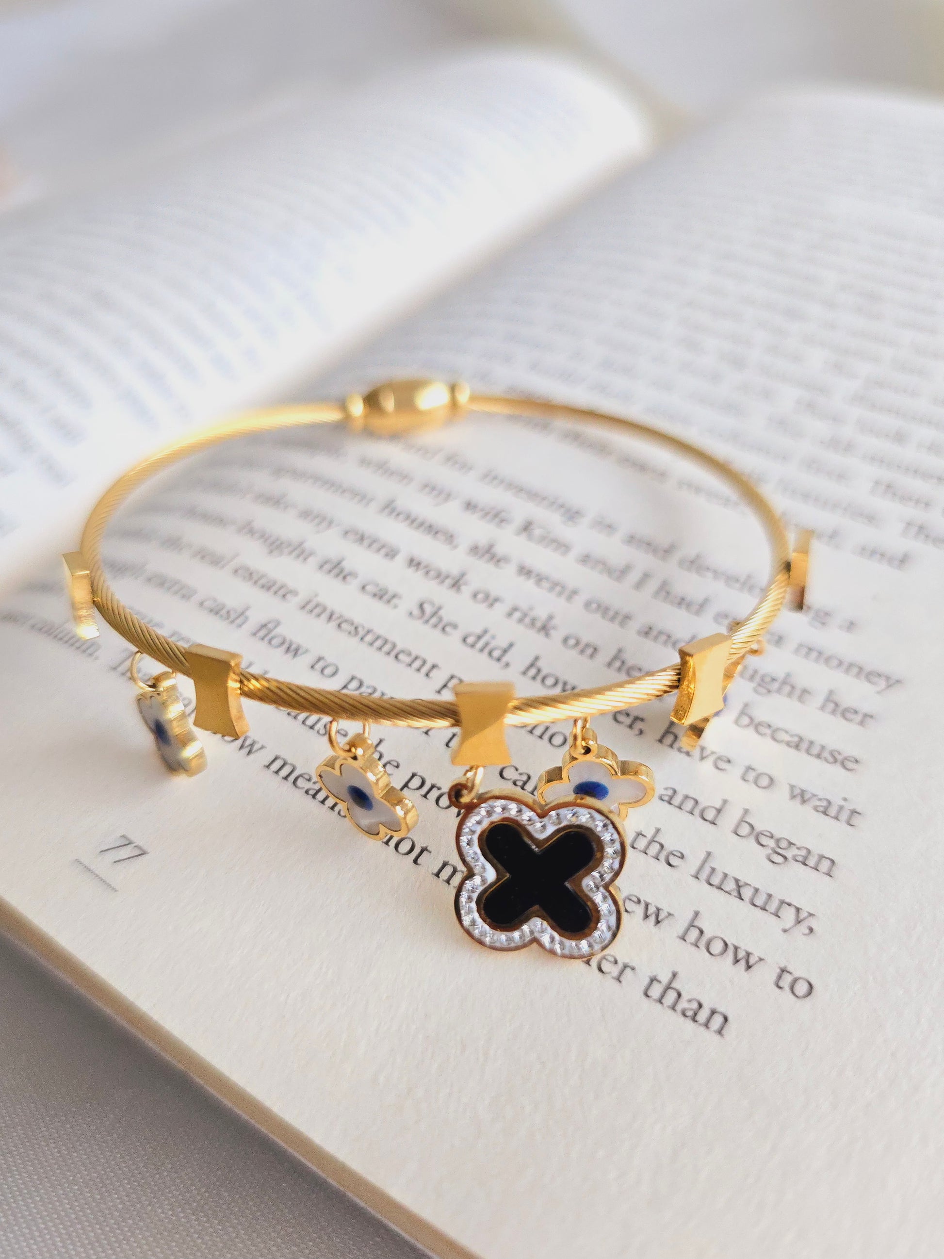 The Enchanted Clover Charm Bracelet brings together timeless charm and modern sophistication. Featuring a stunning black clover centerpiece bordered with sparkling diamonds, complemented by an enchanting clover-style evil eye charm, this bracelet is a symbol of elegance and protection. The sleek magnetic lock ensures a secure and seamless fit, perfect for all-day wear. A must-have for those who value both beauty and meaning.